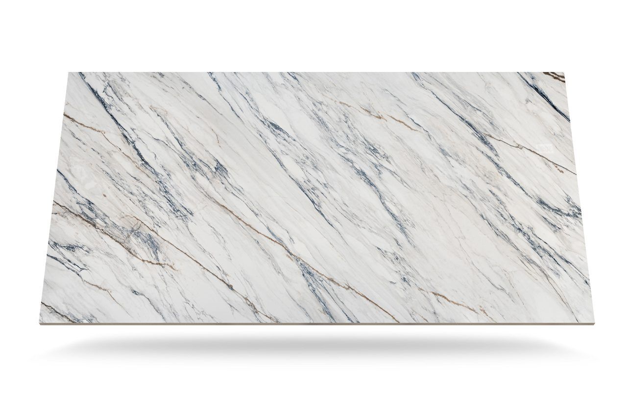 The Trance Porcelain worktop blends elegance with durability, making it a stunning choice for modern interiors. Its cool blue undertones flow beneath a creamy white and soft grey base, while delicate golden and oxide streaks add depth and sophistication. This unique surface reminiscent of Dekton brings a calming yet luxurious feel to kitchens and bathrooms alike.